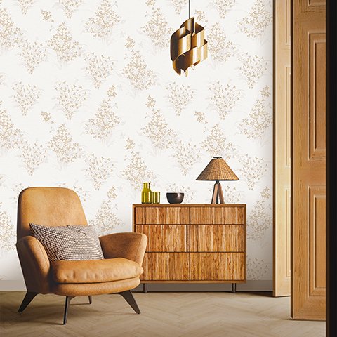Рисунок с повторяющимся фрагментом в 70 см представляет собой изящные ветки и листья, которые плавно переходят друг в друга, создавая впечатление живой природы на стенах. Такой обойный раппорт требует внимания при поклейке, но результат того стоит — стены преобразятся, приобретя глубину и динамичность. Палитра и мотивы хорошо сочетаются с легкой мебелью и натуральными текстурами, характерными для современных интерьеров.
