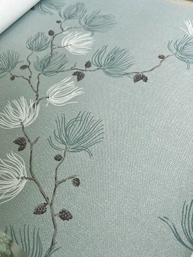 Главной особенностью этой линейки является искусное сочетание благородной цветовой палитры и сложных ботанических узоров. В отличие от многих обоев с лесными мотивами, где преобладают яркие цвета и упрощенные формы, «Лоймина» предлагает изысканные композиции в духе английской гравюры XIX века. Здесь можно увидеть тщательно прорисованные дубовые листья, ветви папоротников, шишки и лесные ягоды, выполненные в благородных оттенках охры, бордового, темно-зеленого и глубокого коричневого. Особый шарм коллекции придает использование эффекта старины – некоторые дизайны выглядят как страницы из старинного гербария, с характерными потертостями и легкой желтизной.