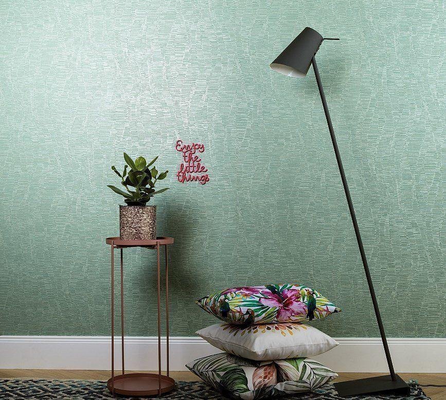 В коллекции представлены различные типы обоев: однотонные с бархатистой текстурой, варианты с элегантными вертикальными и диагональными полосами, а также полотна с абстрактными и геометрическими мотивами. Цветовая палитра выдержана в спокойных, гармоничных тонах — от глубоких серых, жемчужно-бежевых, до благородных оттенков оливы, песка и графита. Такая палитра помогает интерьеру «дышать», не перегружая пространство лишними акцентами, и, одновременно, придаёт ему благородство.