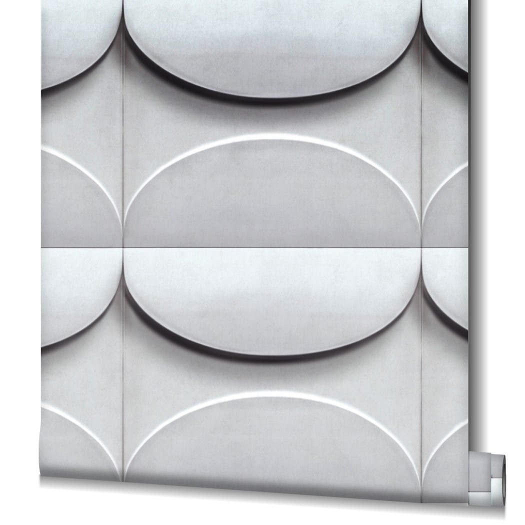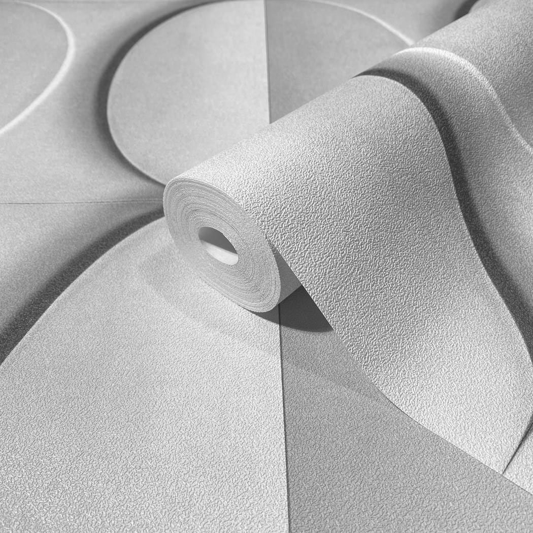 Длина рулона составляет 10,05 метра, а ширина — 0,53 метра, что позволяет легко рассчитывать необходимое количество материала для помещения. Геометрический узор из серых кругов создает спокойную, но выразительную атмосферу, а светлый тон помогает визуально расширить пространство и добавить в интерьер свежести.
