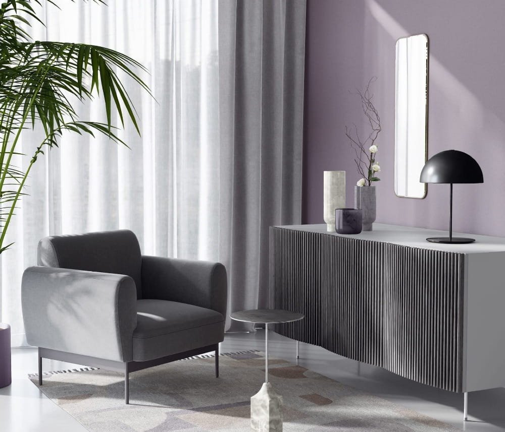 - Сочетаемость: Сиреневый оттенок хорошо сочетается с другими цветами, такими как белый, серый, сиреневый, фиолетовый, мятный и даже с яркими оттенками, что позволяет экспериментировать при оформлении интерьера.